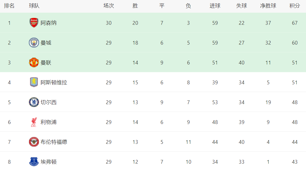 在积分榜上,赢球的阿森纳继续领跑,总积分达到67分。而曼城丢掉了至关重要的2分,总积分只有60分,被阿森纳甩开了7分。虽然曼城比阿森纳少踢1场,但显然已经完全失去了争冠主动权。曼联落败,依然是51分,排名第3。同样落败的阿斯顿维拉也是51分,排名第4。切尔西赢球后,总积分达到48分,排第5。同样48分的利物浦则排名第6。争四局面非常惨烈。